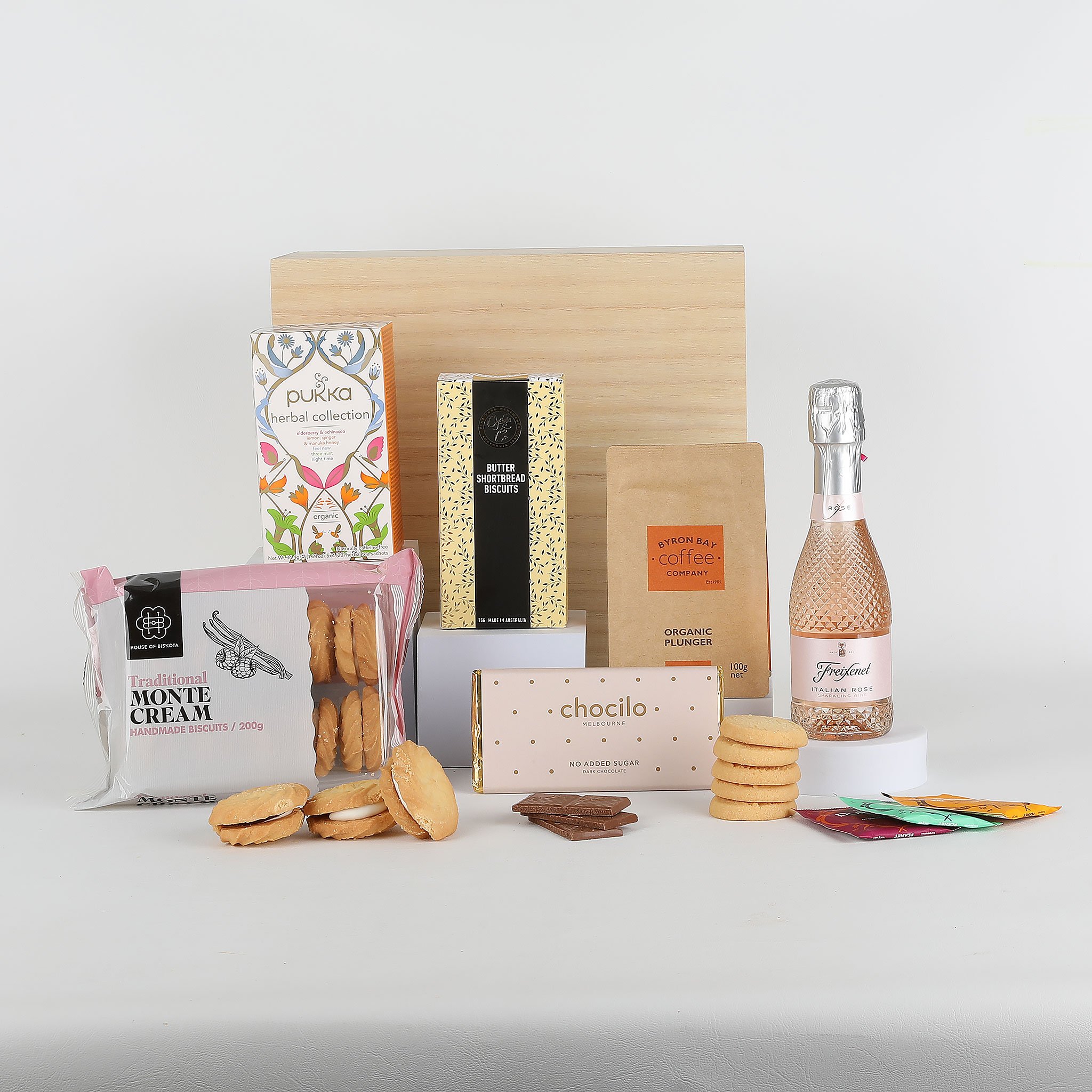 This beautifully presented gift hamper features a bottle of Italian Rosé alongside a delightful selection of coffee, cookies, tea, and chocolates. Elegantly packed in a wooden gift box, it’s finished with ribbon, a double bow, and a gift card for your personal message.