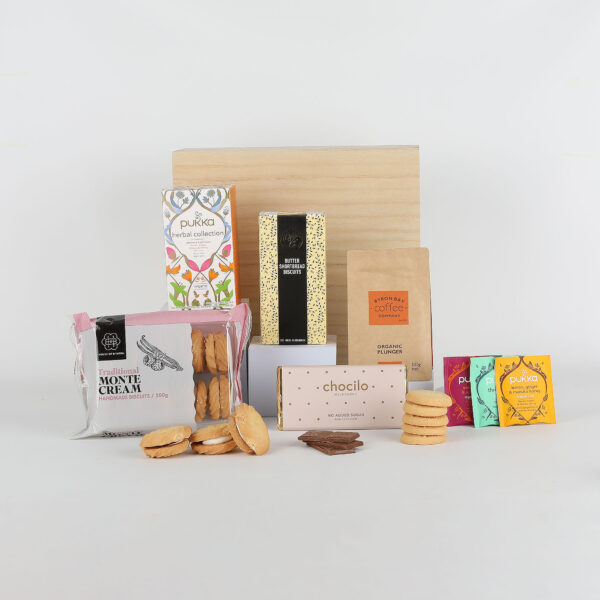 A stylish gift hamper featuring Byron Bay coffee, complemented by a delicious assortment of cookies, tea, and chocolates. Presented in a wooden gift box and finished with ribbon, a double bow, and a gift card for your message.