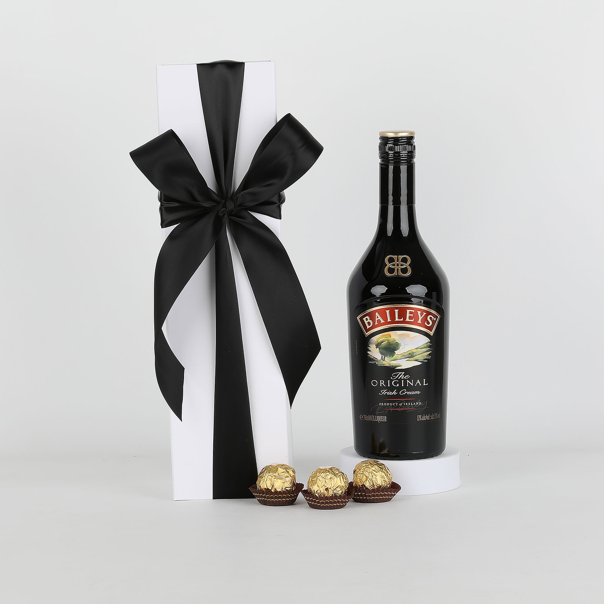 Baileys Irish Cream 700mL gift box with 3 Ferrero Rocher chocolates. Presented in a luxury black or white gift box with ribbon and card.