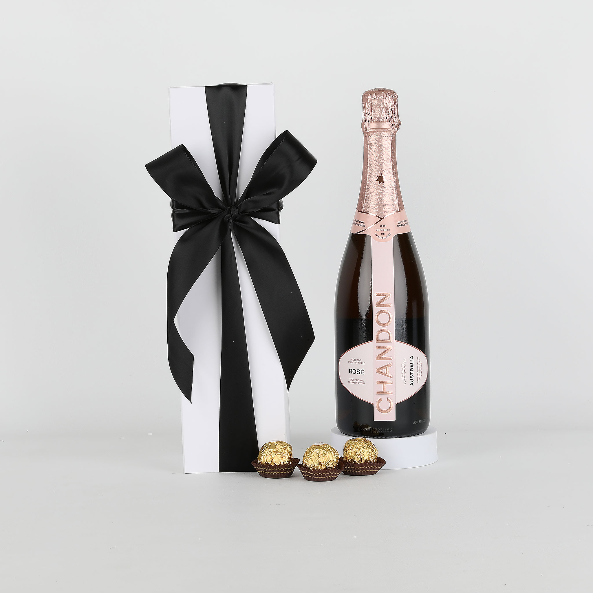 A bottle of Chandon Brut Rose 750ml sparkling wine in a black or white gift box with 3 X Ferrero Rocher’s and a gift card