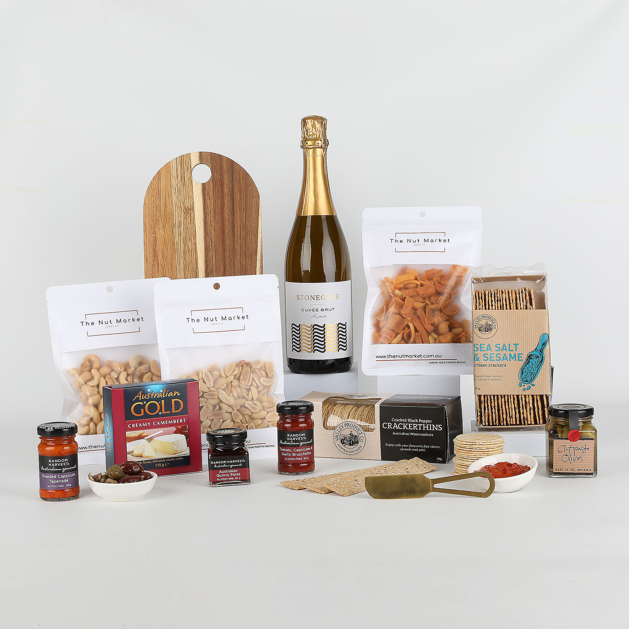 This exquisite Cheese Platter & Bubbly Gift contains a great selection of sweet and savoury nibbles, cheese, tapas nuts, paired with a bottle of Stonegate Cuvee Brut, cheese board and cheese knife. Thoughtfully presented in a luxury white gift box with magnetic locking, ribbon, double bow, and personalised card.