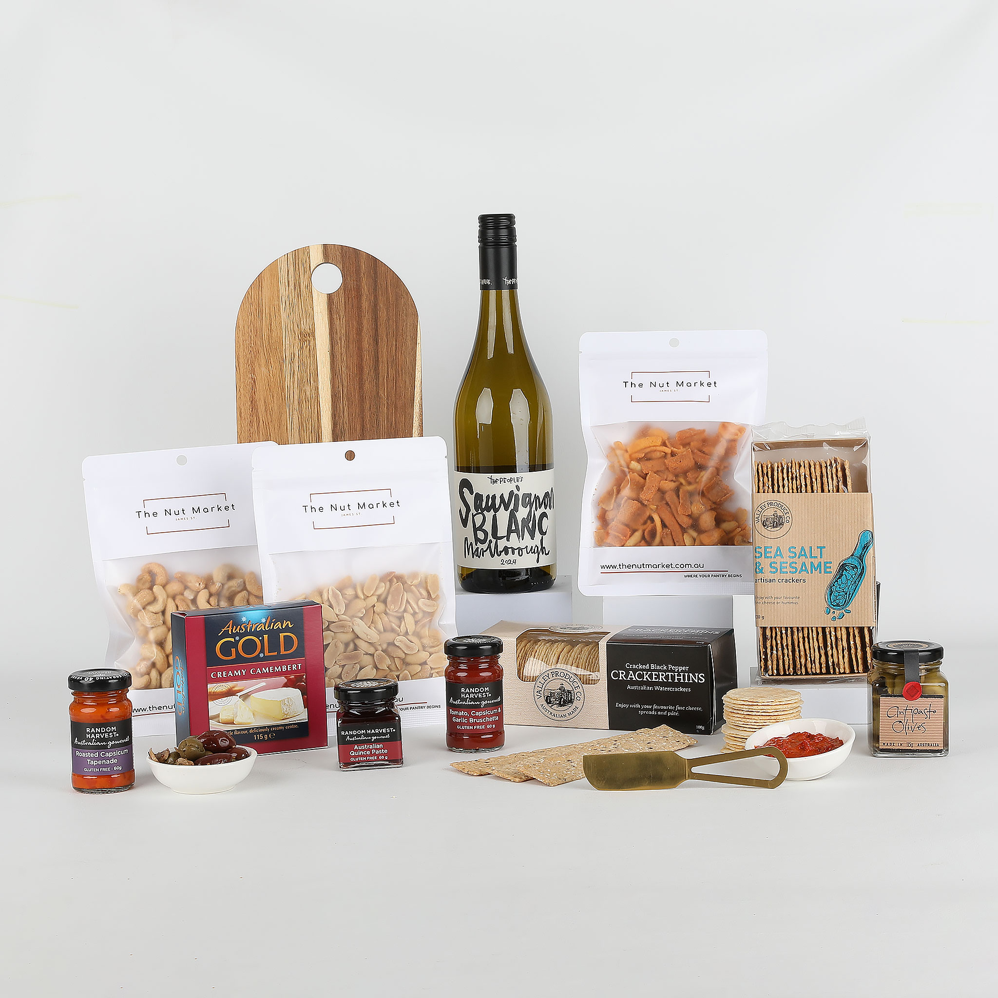 A refined wine and cheese platter gift, featuring a bottle of The People’s Sauvignon Blanc, gourmet cheeses, savoury snacks, and a cheese board with knife. Beautifully presented in a luxury white gift box with magnetic closure, ribbon, and a personalised gift card.