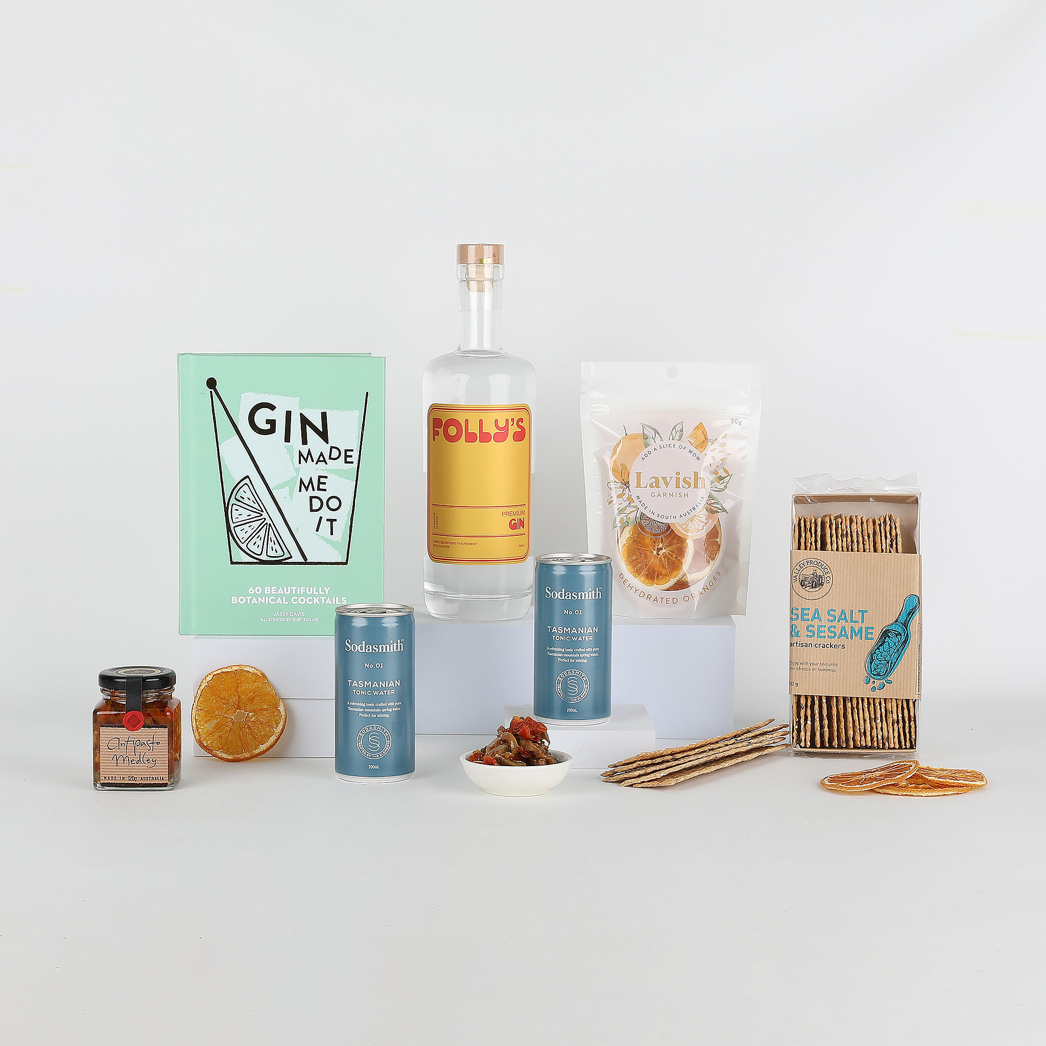 The Gin Lovers Gift Hamper features a thoughtfully chosen assortment of goodies, including Folly’s Premium Gin (proudly Gold Coast owned), Sodasmith’s Tasmanian Tonic Water, a mix of delicious snacks, and the crowd-favourite cocktail recipe book Gin Made Me Do It.