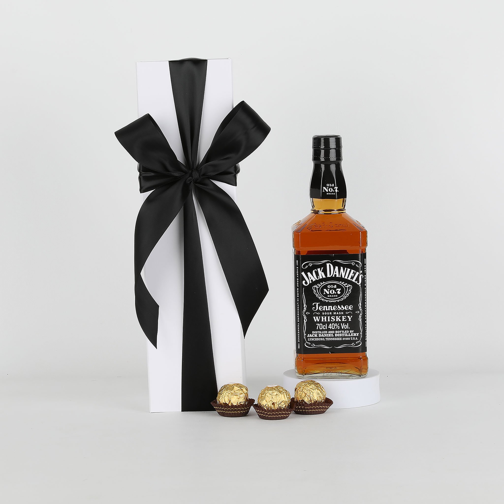 Jack Daniels Whiskey Gift Box contains 1 X Jack Daniels Whiskey 700ml and 3 Ferrero Rocher chocolates, presented in a luxury gift box with ribbon and card.