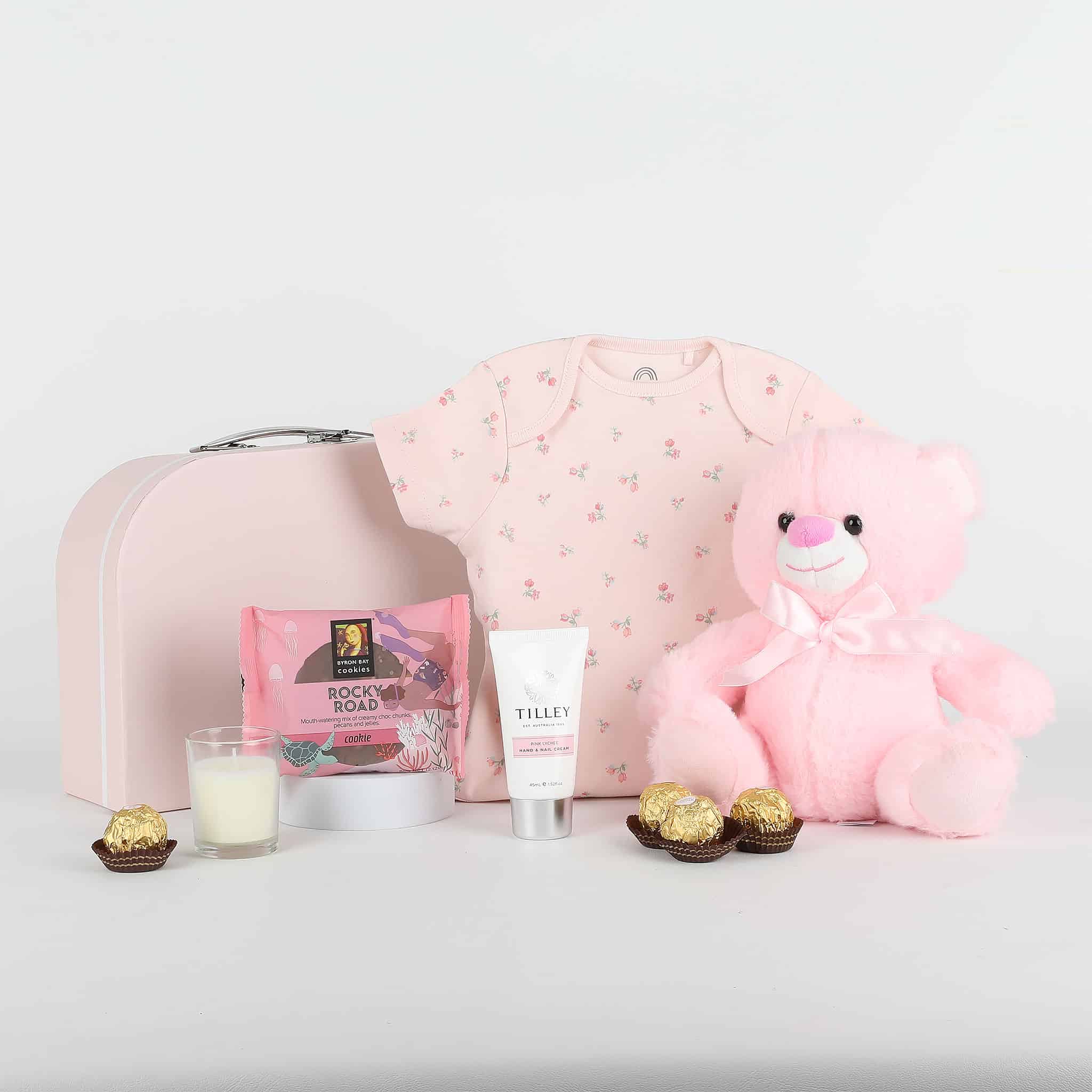 The perfect way to welcome home a new baby girl! The Newborn Baby Girl Gift in Suitcase contains a super soft teddy bear, organic cotton onesie, hand cream, scented candle and premium chocolate cookie. Beautifully presented in a luxury gift suitcase with ribbon, double bow and personalised card. (Full description below)