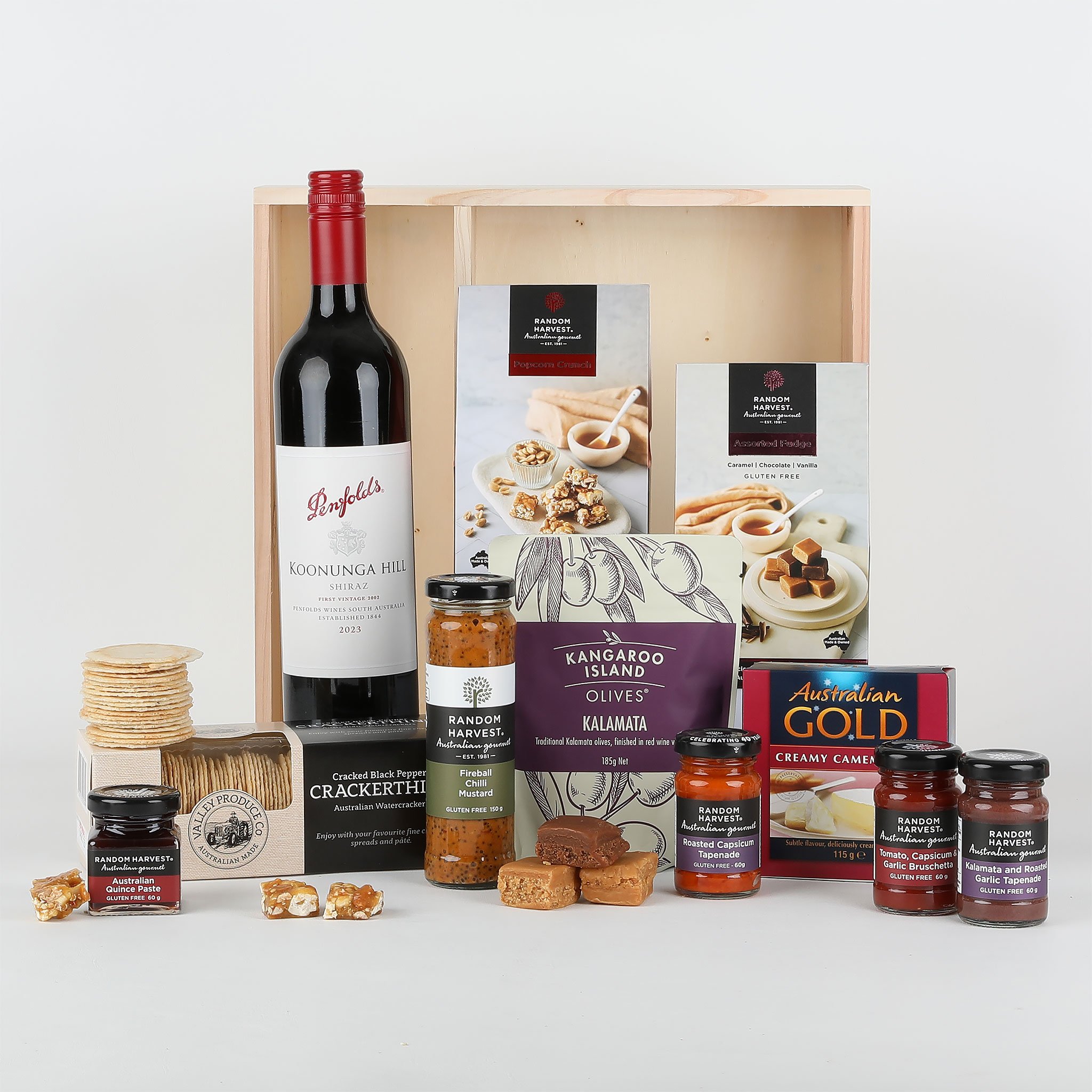 This Stunning Gourmet Wine Gift Hamper is sure to impress for a multitude of occasions. This Hamper comes in a beautiful wooden Gift Box, pairing delicious Random Harvest sweet and savoury products with a popular Penfolds Max’s Shiraz.