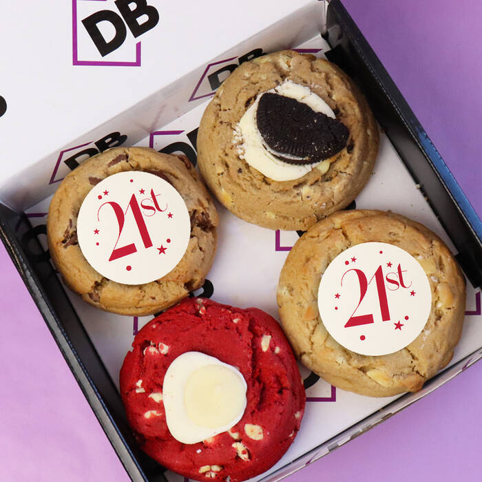The best way to commemorate a 21st birthday! This indulgent Birthday Cookie Box contains 4 chewy, gooey, thick New York Style cookies from Gold Coast Cookies, complete with two white chocolate edible 21st Birthday messages. It's a fun, modern treat that's perfect for celebrating this milestone occasion.