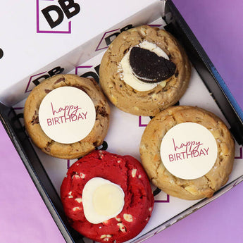 Send a gift that really says 'Happy Birthday' in the most delicious way possible! This thoughtfully curated box contains 4 chewy, gooey, thick New York Style cookies from Gold Coast Cookies, complete with white chocolate edible Happy Birthday messages. Beautifully presented and perfect for celebrating, it's an indulgent treat that's sure to bring a smile.