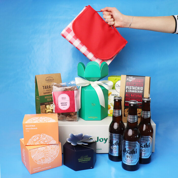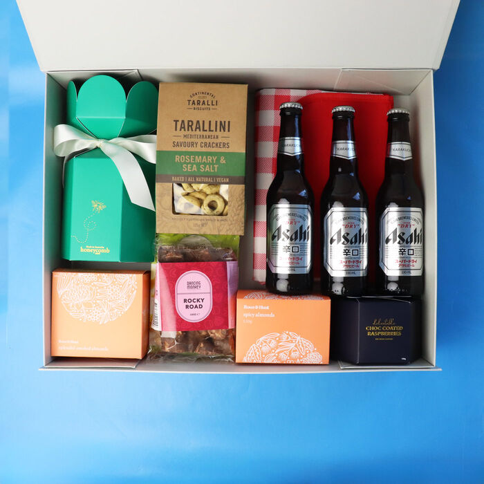 The Asahi Beer Hamper is the perfect gift for the beer lover in your life. Thoughtfully curated by Edible Blooms, this hamper brings together premium Asahi Super Dry beers with a delicious selection of locally sourced sweet and savoury snacks—all beautifully presented with a classic red and white picnic rug for the ultimate outdoor experience.