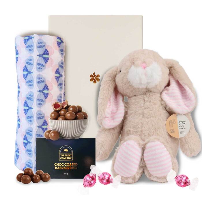 Inside, you'll find a plush toy bunny to become baby's first friend, an Aden and Anais swaddle in soft pastels (colours may vary), and a sweet selection including Strawberries and Cream Lindt Balls and The Treat Co Choc Coated Raspberries (150g) – a lovely way to congratulate the whole family.