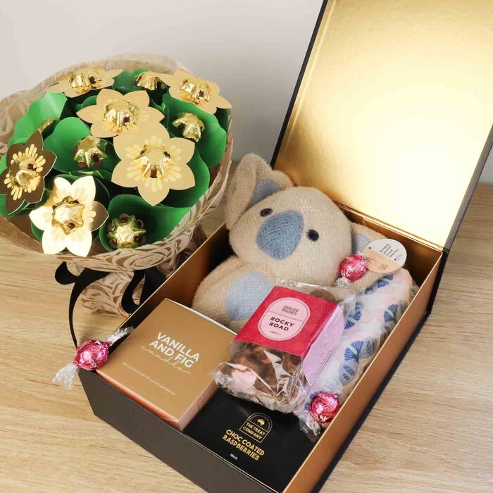 Celebrate the arrival of a precious new baby with this thoughtfully curated Baby Koala Hamper – a beautiful Australian-themed gift that's perfect for hospital visits and allergy-conscious new parents. Thoughtfully designed by Edible Blooms, this premium yet accessible hamper combines soft comforts, indulgent chocolates, and a stunning golden bouquet to create a truly memorable welcome.