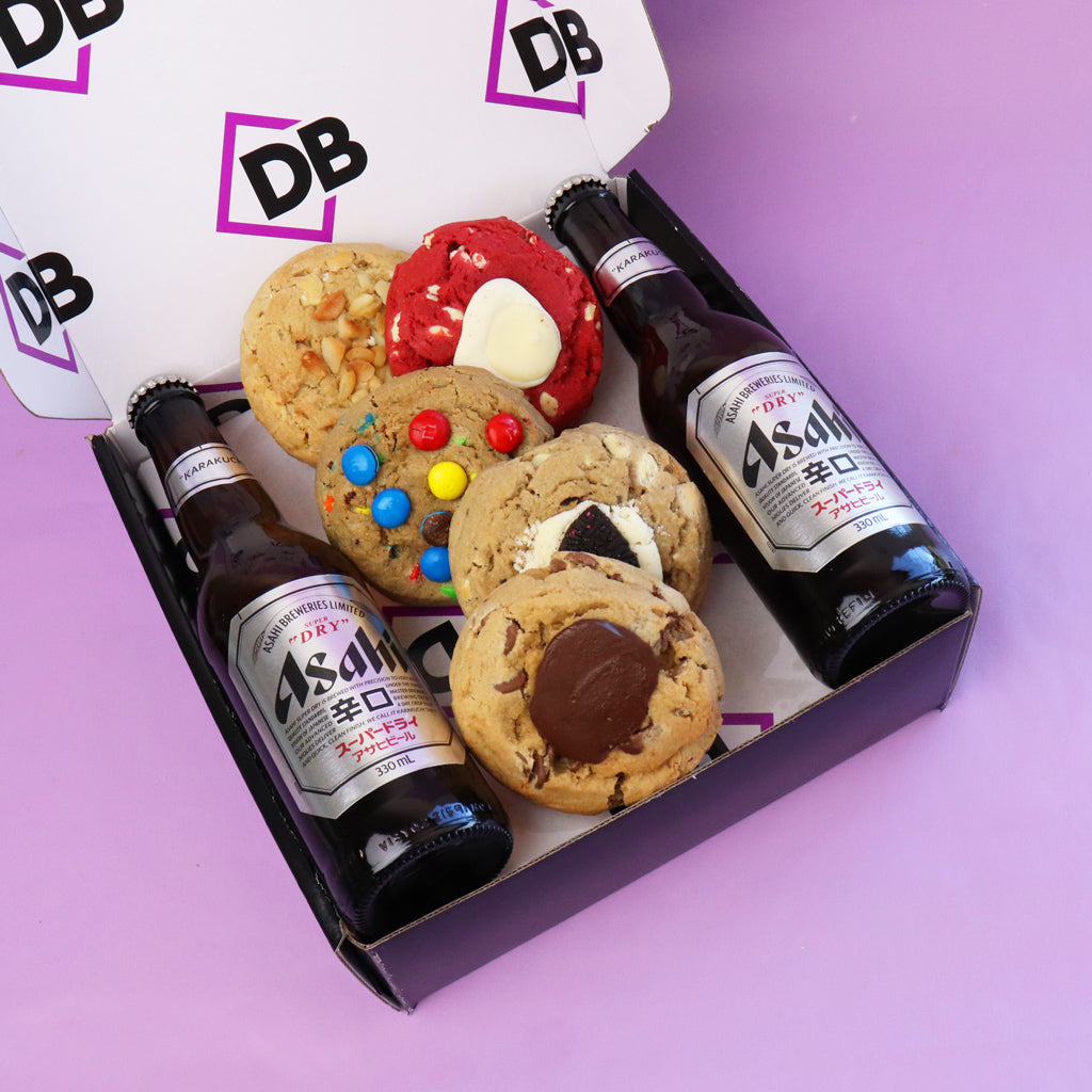 This Dessert Box is loaded with 5 chewy, over-the-top cookies that redefine what a cookie should be. Each one is thick, decadent, and packed with flavour – think choc hazelnut filled, red velvet, white choc macadamia, cookies and creme (Oreo), and M&M. Plus, you get 2 x Asahi beers to complete the vibe.