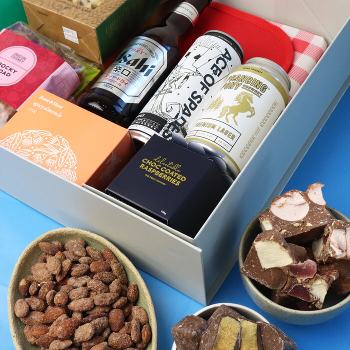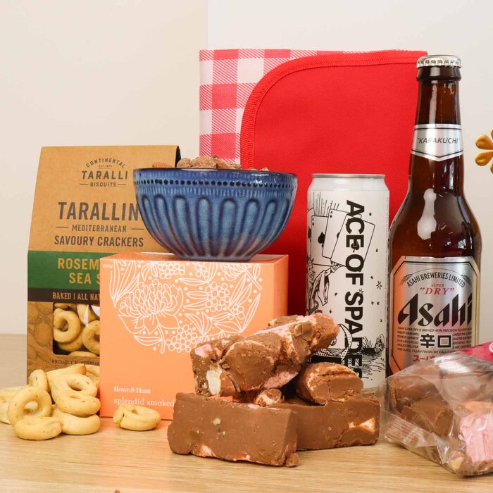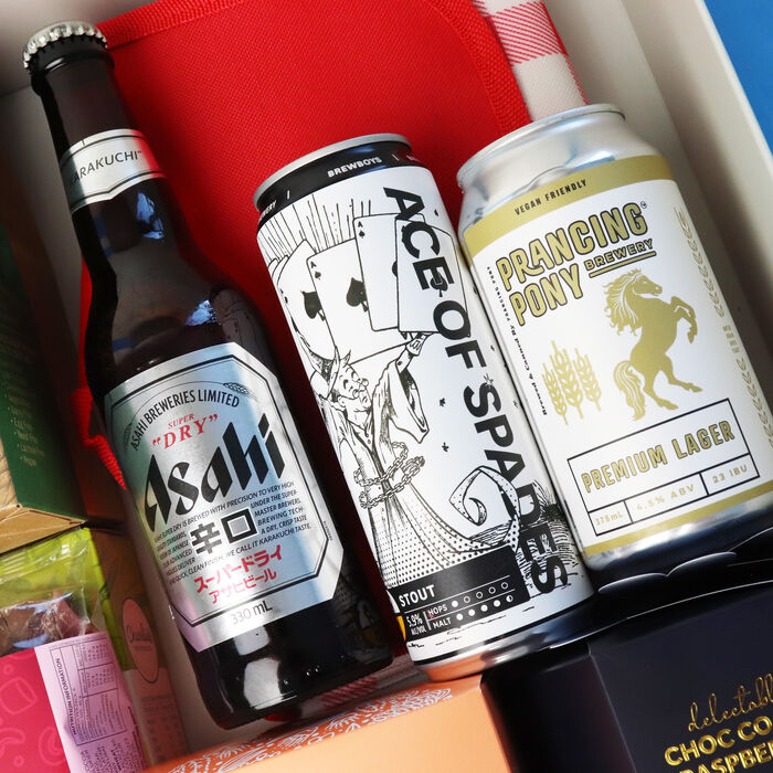 The perfect gift for the beer connoisseur in your life. This thoughtfully curated hamper brings together a selection of three premium beers—Asahi, Prancing Pony, and BrewBoys—complemented by a range of delicious snacks and a red and white picnic rug. Ideal for celebrating special occasions or simply treating someone who appreciates quality craft brews and gourmet nibbles, this hamper is beautifully presented and ready to impress.