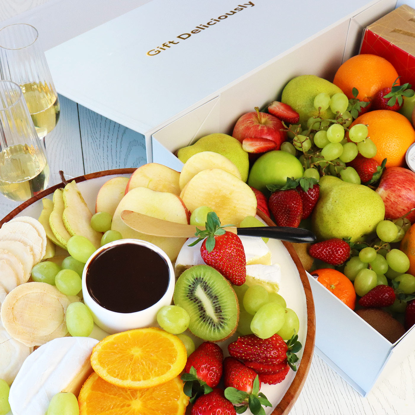 This thoughtfully curated large fruit hamper pairs premium fresh seasonal fruit with sparkling wine and gourmet nibbles for a truly elegant gifting experience. Beautifully presented by Edible Blooms, it includes a selection of 14 large fruits, strawberries, grapes, Barossa Valley Cheese Co Camembert, crackers, Beerenberg relishes, chocolate dipping sauce, and Mumm Marlborough Brut Prestige. Complete with a wooden cheese knife, it's perfect for creating an impressive fruit and cheese platter. Ideal for group celebrations, family gatherings, or corporate occasions, this indulgent gift box combines fresh, premium ingredients with sophisticated touches.