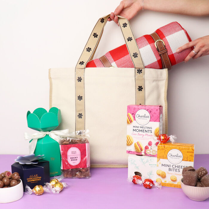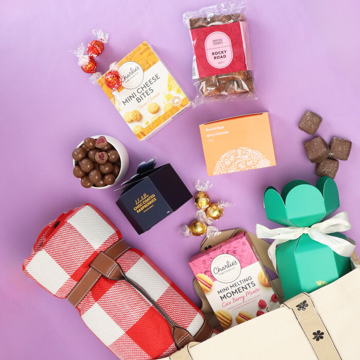 A combination of favourite gourmet treats and a full-sized picnic rug, thoughtfully curated for outdoor entertaining.