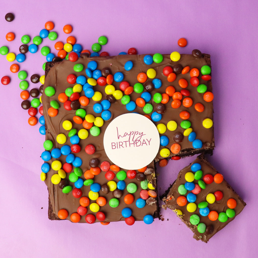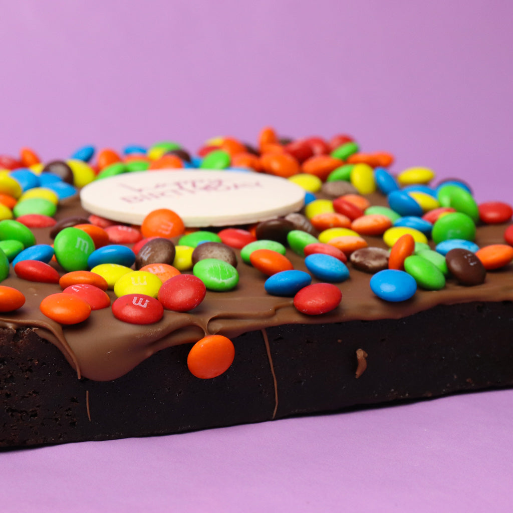 Happy Birthday, never tasted so fun! This indulgent treat combines the unmistakable crunch and colour of M&M's with a rich, decadent chocolate brownie base. Topped with a white chocolate Happy Birthday message, it's a playful and delicious way to celebrate.