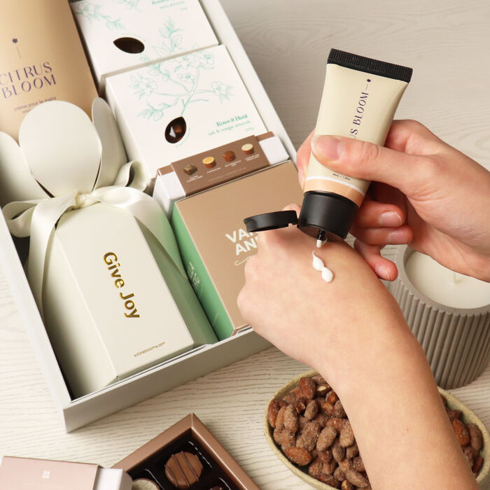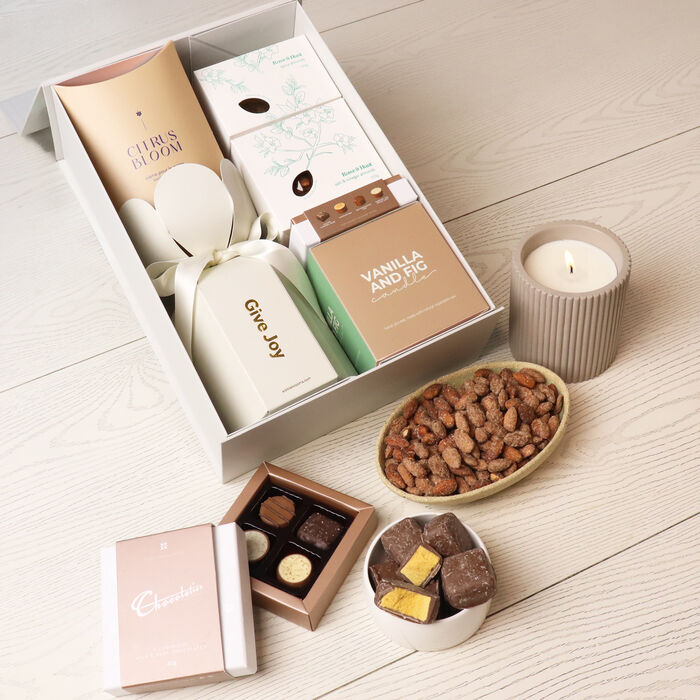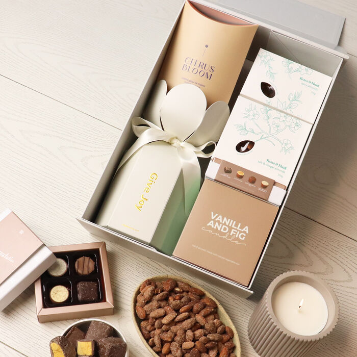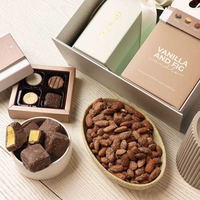 An elegant hamper thoughtfully curated to treat all the senses. This beautiful gift brings together gourmet chocolates, scented candles, luxurious hand cream and more—a premium yet accessible indulgence that feels both special and personal.