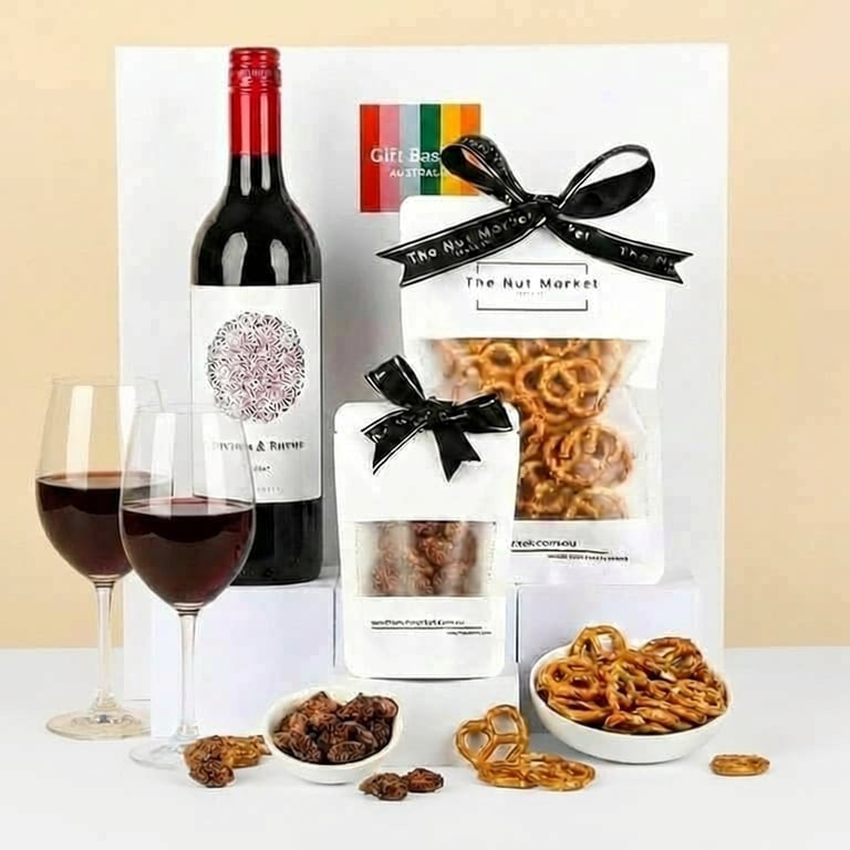 What more could you wish for in a Christmas gourmet hamper than a smooth Australian red wine and locally produced quality nibbles? Our Red Wine & Nibbles Hamper is an elegant gift hamper. Rhythm & Rhyme Shiraz is featured in this hamper beautifully presented with The Nut Market’s finest treats — including crunchy salted pretzels and caramelised nuts. What do we love the most? It's the curated balance of sweet and savoury indulgences.