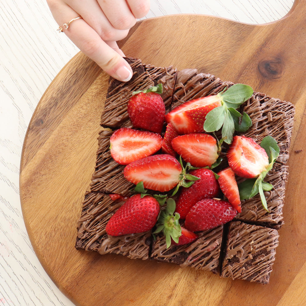 Rich, gooey, and fudgy—this indulgent chocolate brownie brings together deep cocoa decadence with the bright, sweet-tart burst of fresh strawberries. It's a playful twist on a classic treat, where indulgence meets a pop of fruity freshness and vibrant colour.