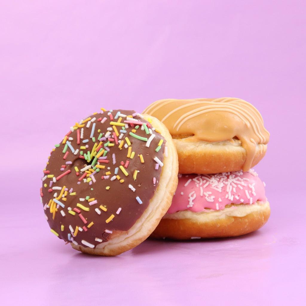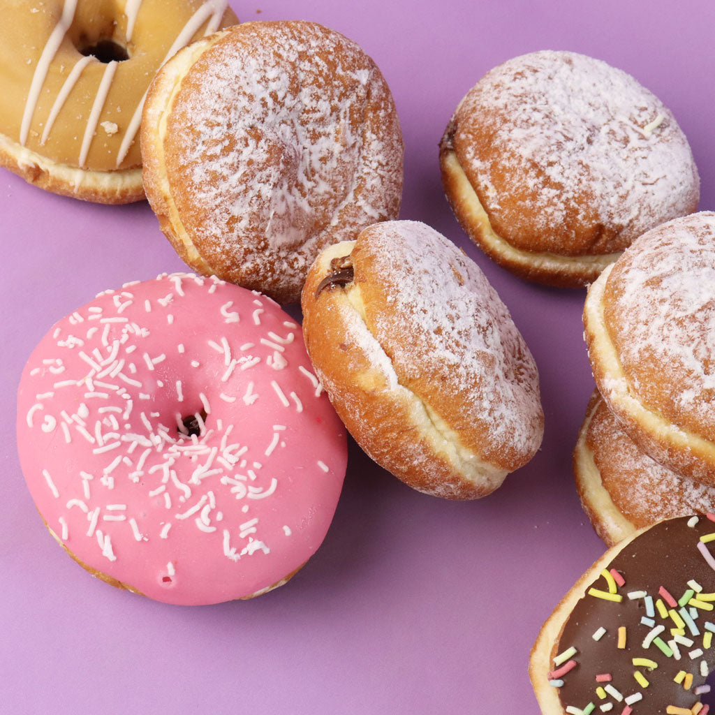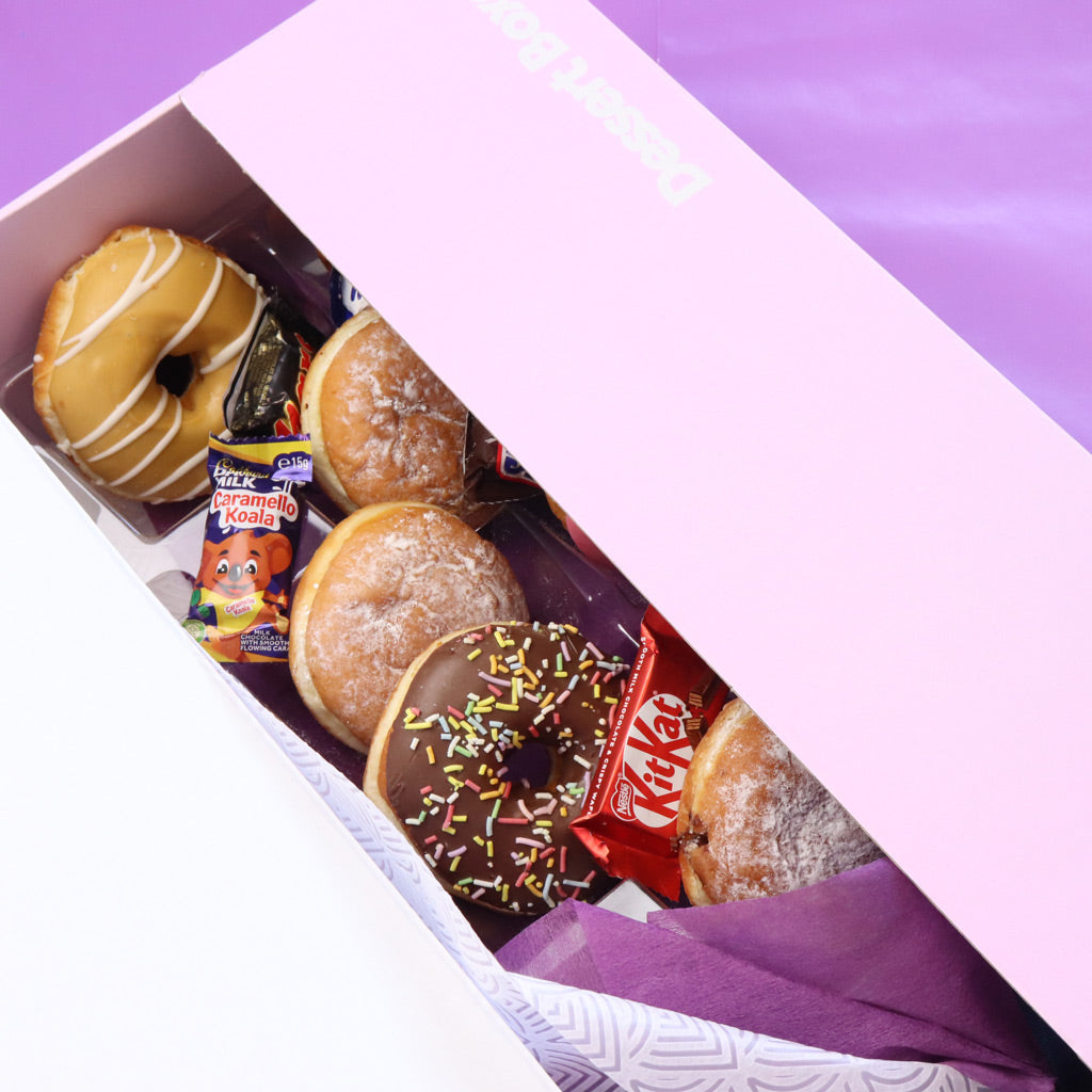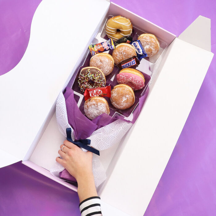 5 x Nutella Filled Donuts with Icing Sugar 1 x Chocolate Ring Donut with Sprinkles 1 x Strawberry Ring Donut with Sprinkles 1 x Caramel Ring Donut with Sprinkles 5 x Fun Size Chocolates