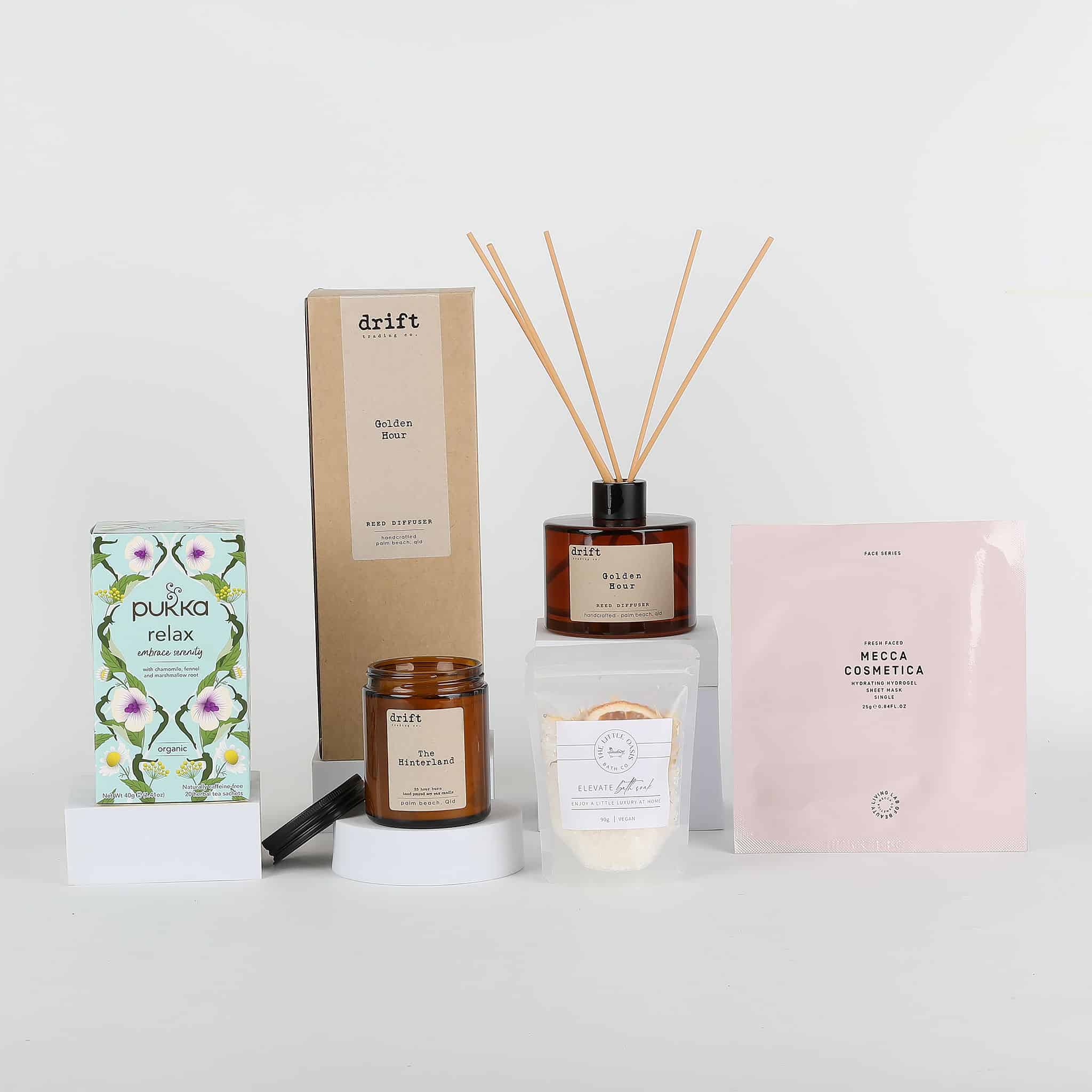 Create the ultimate relaxation experience with the ‘Relax & Unwind’ hamper. It includes a Drift Candle and Diffuser in assorted scents to set a calming mood, while Pukka’s Relax Tea Bags and The Little Oasis Vegan Bath Soak provide soothing self-care moments. Pamper yourself with a Mecca Cosmetica Hydrating Sheet Mask, and finish with a luxurious Satin Eye Mask. This hamper is the perfect gift for relaxation and rejuvenation.
