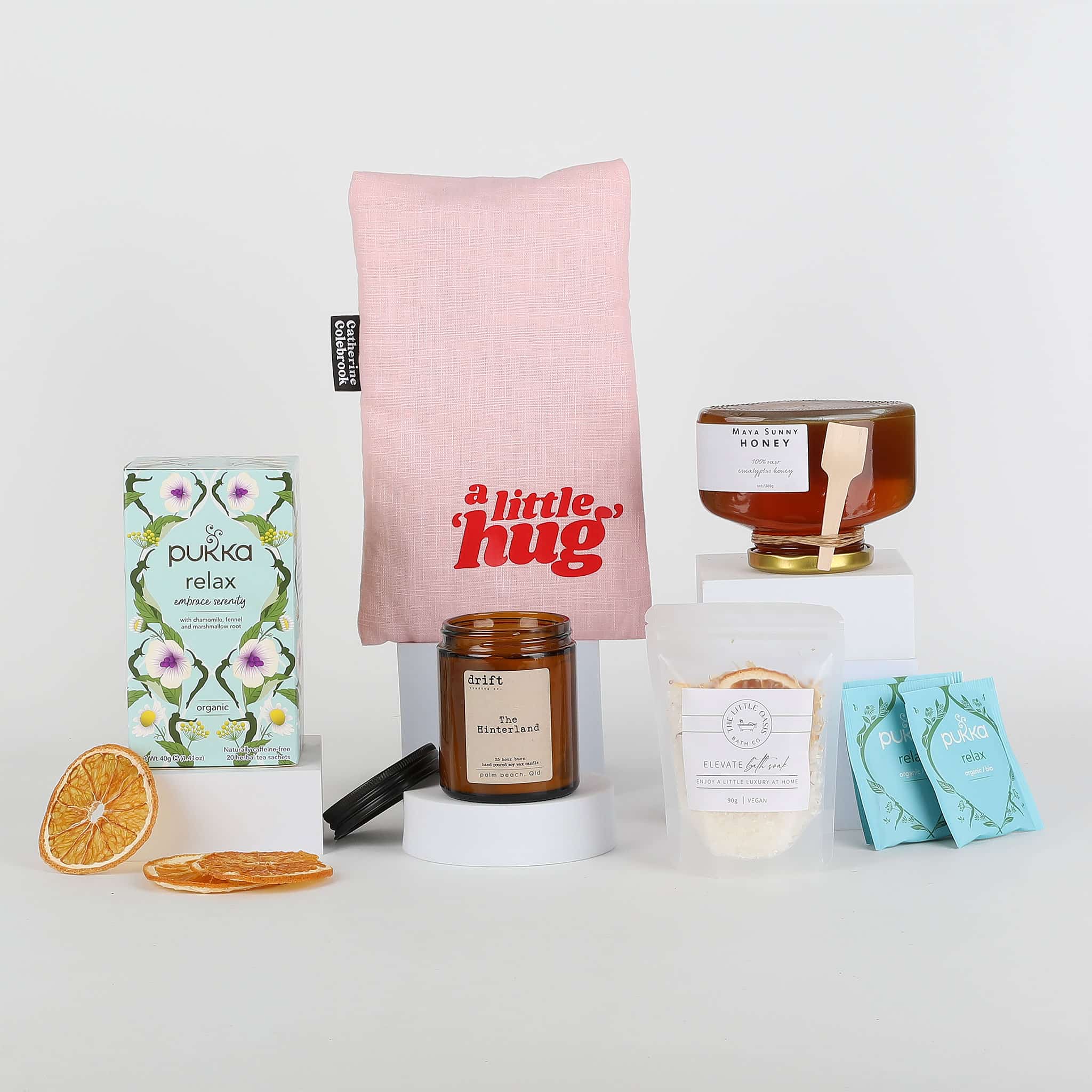 Embrace wellness with this thoughtfully curated hamper, designed to promote relaxation and self-care. It includes a calming Drift Candle, Billion Bees Local Raw Honey for a natural touch of sweetness, and Pukka Breathe In Tea Bags for soothing moments. The Little Oasis Vegan Bath Soak offers a calming soak, while the ‘A Little Hug’ Mini Hot Water Bottle adds comfort and warmth. The perfect gift for moments of relaxation and rejuvenation.